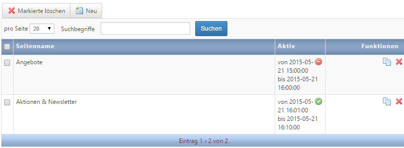 Wenn Sie weitere Seiten mit einem Navigationspunkt verbinden wollen, gehen Sie im Rechtsklick-Menü des Navigationspunktes auf Verbundene Seiten. Hier können Sie über Neu eine weitere Seite aus der Liste auswählen und mit dem Punkt verknüpfen. Die Seitenverbindung muss aktiv sein. Außerdem können Sie hier den Veröffentlichungszeitraum bestimmen, so dass z.B. automatisch zwischen einer Sommer- und Winterseite umgeschaltet wird.
